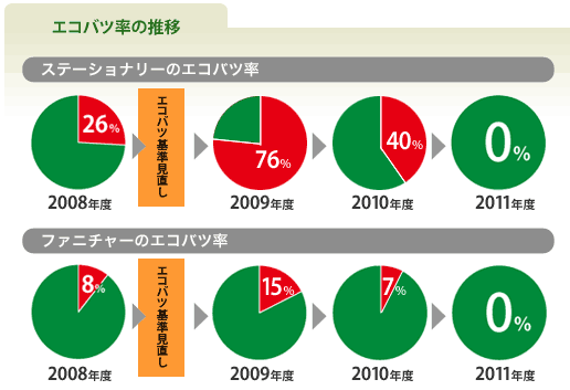 古川 厳しいルールに改めたことで、2009年度のスタート時でステーショナリーのエコバツ率は76%に、ファニチャーのエコバツ率は15%になりました。しかしこの1年間、関係部署が全力で取り組んだ結果、2010年度版カタログのステーショナリー編は76%を40%に、ファニチャー編は15%を7%に引き下げることができました。本当にグループの全員ががんばった成果だと思います。