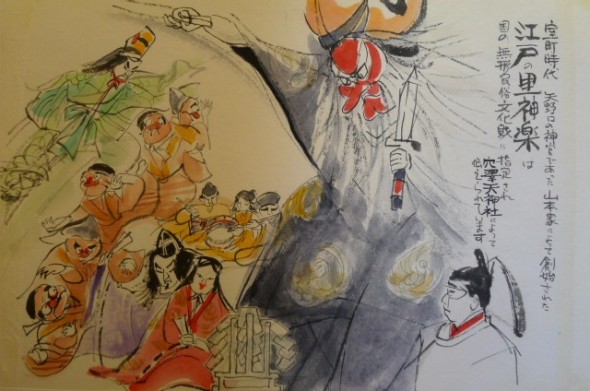 江戸の里神楽(上)と祭礼で舞う若者たち(下)を描いた作品