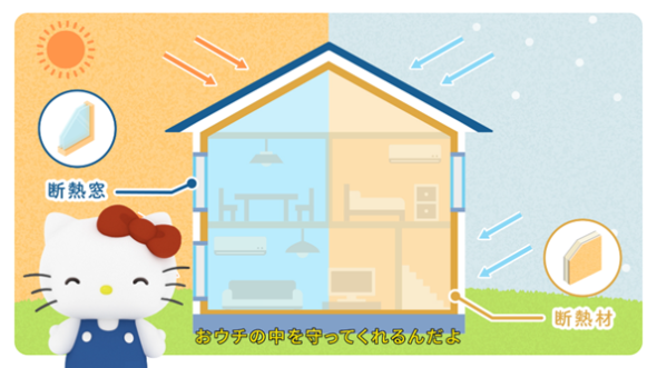 第1弾となる今回の動画では、ハローキティと一緒に「燃費のいい家の秘密」を探していく中で、太陽光パネルや高い断熱性能を備えた住宅のメリットを知ることができます。 ぜひご覧ください。