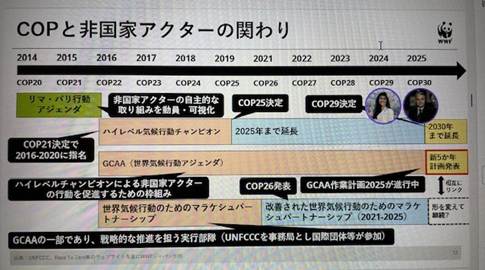COPでは、国連会議としての正式な合意とは別に、国やセクターを超えた企業や都市・自治体、市民団体などの非国家アクターとよばれる有志の参加と発表も増えています。気候変動対策への国際的な「揺り戻し」が心配される中、こうした非国家アクターの取り組みは交渉をより良い方向に導くための後押しとなっています。