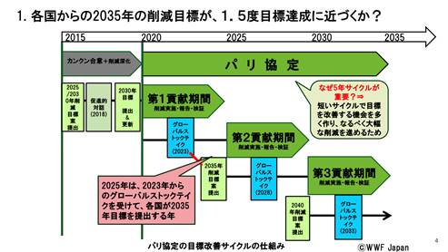 ※グローバル・ストックテイク(Global Stocktake):パリ協定に基づいて5年ごとに実施される評価プロセス。各国が温室効果ガス排出削減目標の達成状況を確認し、地球規模での進捗を総合的に把握するためのもの。