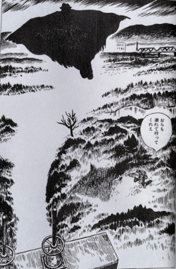 下の絵は、その中でも印象に残る1コマ。マンガ『無能の人』シリーズの『鳥師』に描かれた多摩川の水門です。この水門はつげさんの作品に幾度も登場します。
